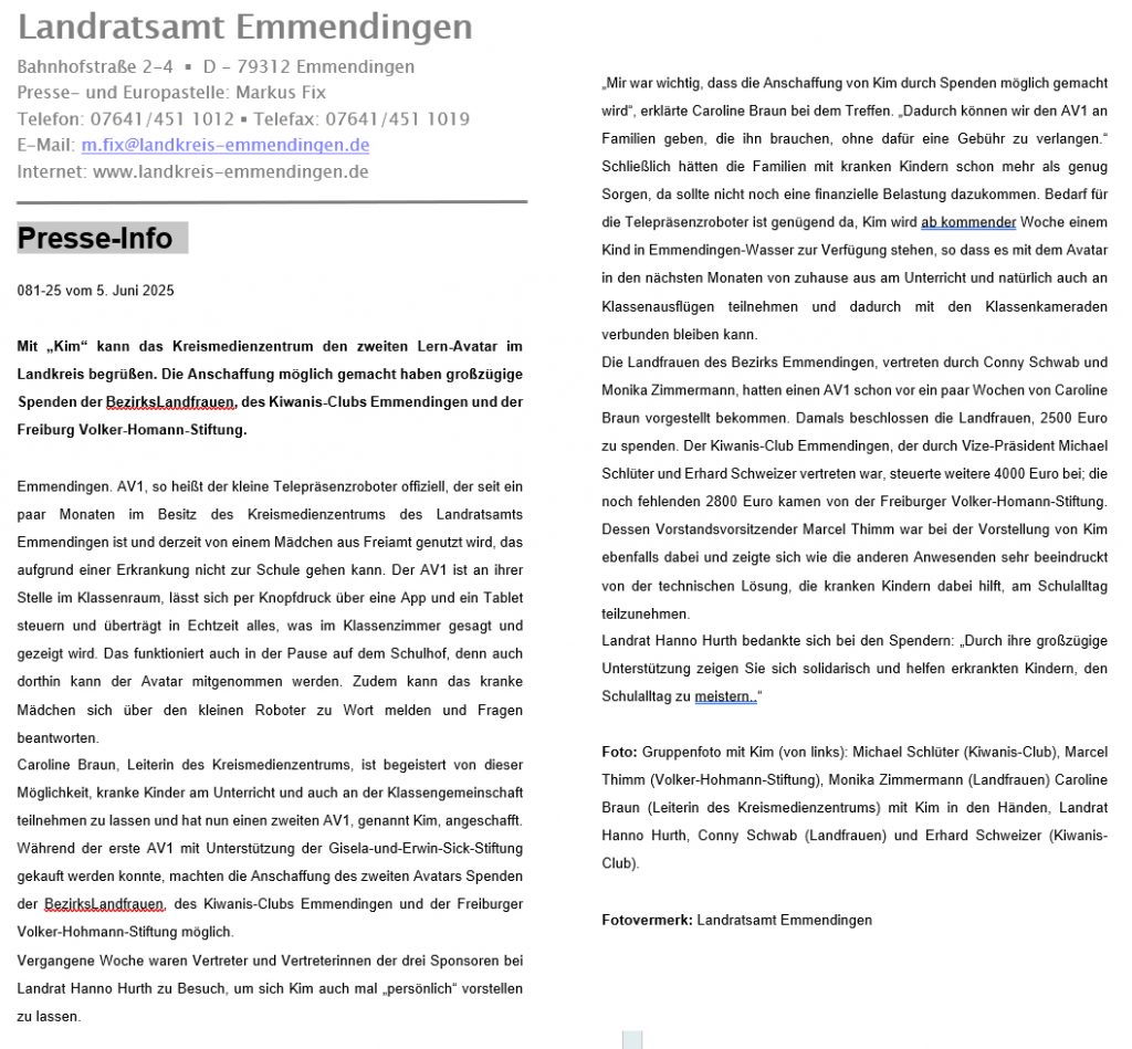 Mit „Kim“ kann das Kreismedienzentrum den zweiten Lern-Avatar im Landkreis begrüßen. Die Anschaffung möglich gemacht haben großzügige Spenden der BezirksLandfrauen, des Kiwanis-Clubs Emmendingen und der Freiburg Volker-Homann-Stiftung.